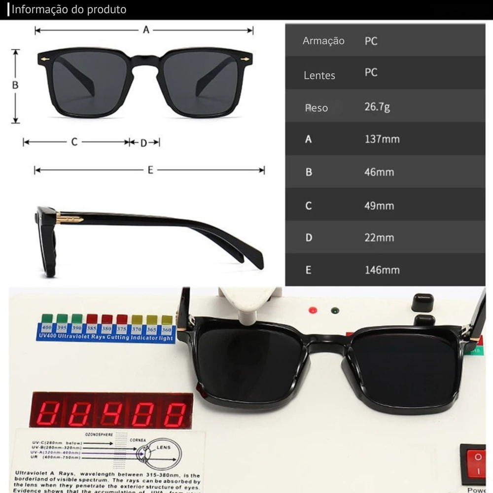 Lentes leves e resistentes com tecnologia UV400, desenvolvidas para durabilidade e conforto prolongado. Mais do que um acessório: cuidado com seus olhos e acabamento premium.